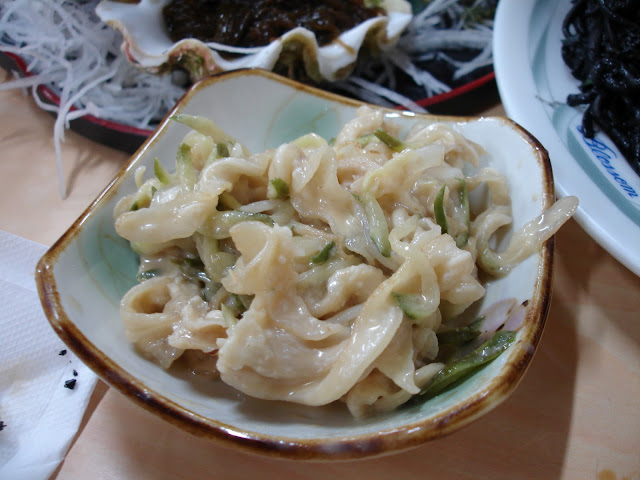 夜光貝的口感軟中帶脆,除了散發一股淡海香氣外,配上醬料還引發一股鮮甘滋味,和著夜光貝的彈牙讓陣陣的鹹中帶甜在味蕾及齒間如是跳躍,有來的話點上一顆不會很貴唷^^