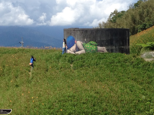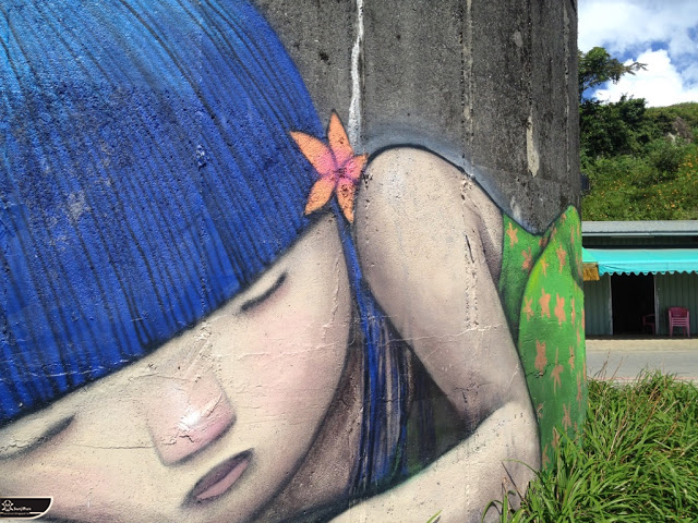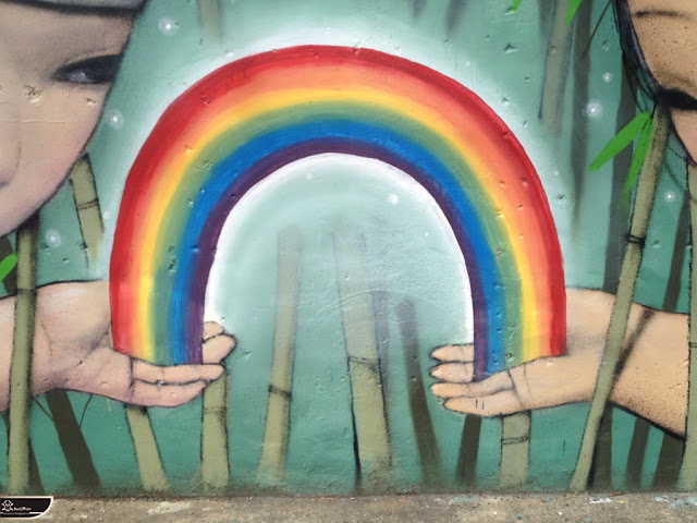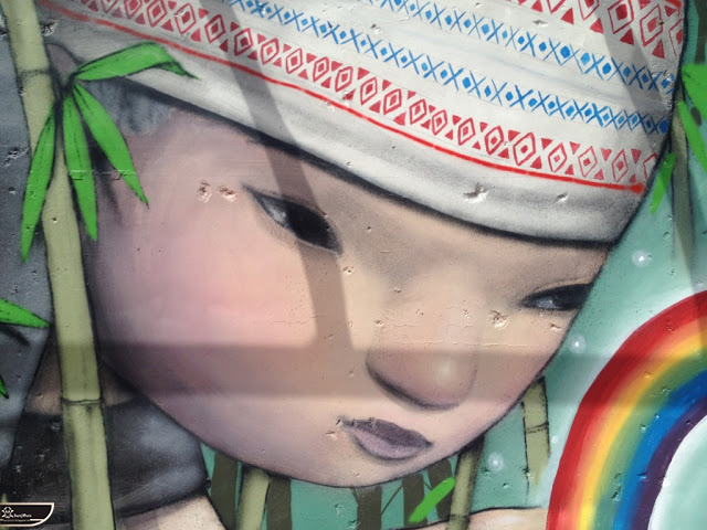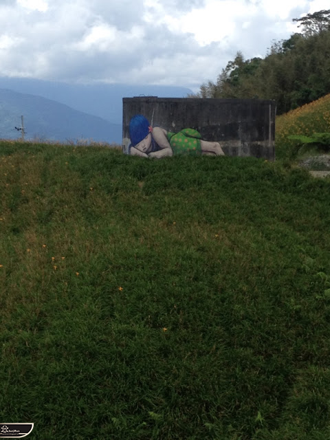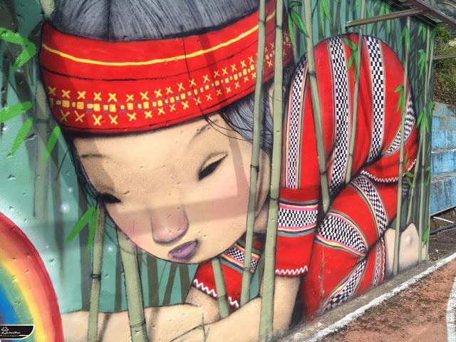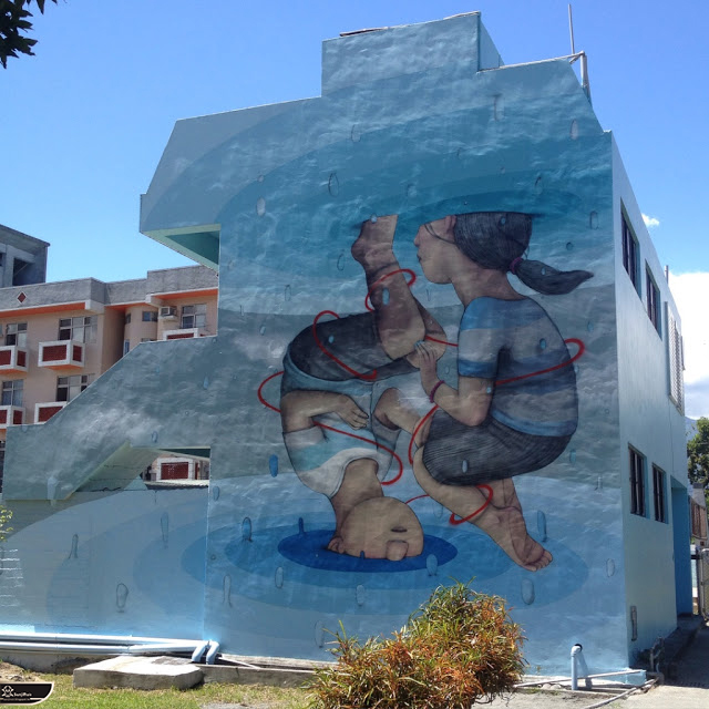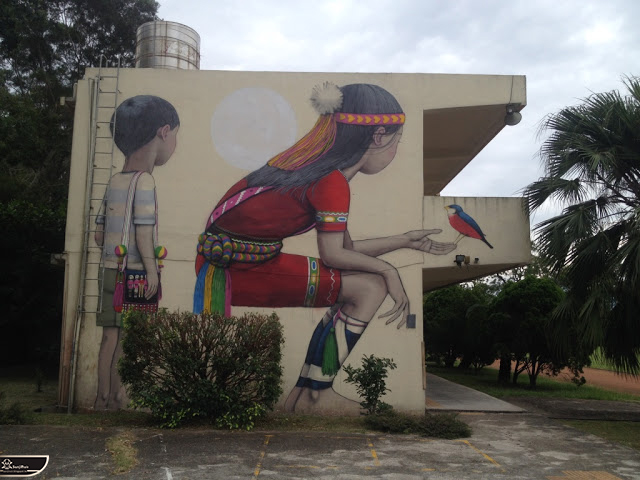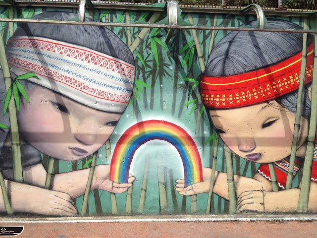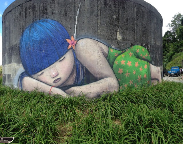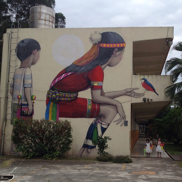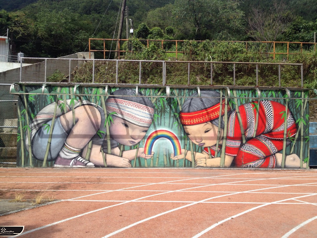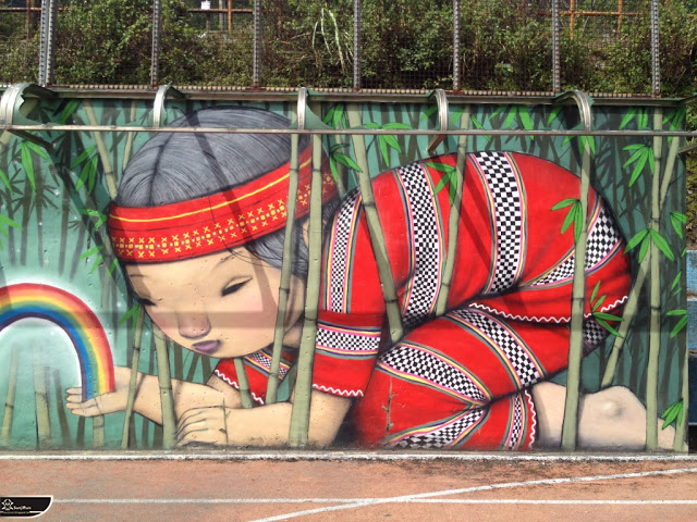 我個人最推崇的是地點選擇,不曉得是主辦單位決定,還是他個人的想法。像是萬安國小教學大樓與男孩、女孩、小鳥那種沈靜的搭配,牆邊的樹又正好成為傳統服飾女孩的座椅;瑞美國小的泳池外牆與主題的搭配,一整個完整。好似在水中看見浮出水面的人,搭配原有的學生描繪學校特點作品,承接順暢;金針花海中的沉睡小女孩的水塔點,整個是渾然天成,不論是看這作品本身或是以作品角度觀看環境,都是美景;錦屏國小那彩虹橋的概念,與學生活動的主要場域操場的對應,我無法挑惕。這些都已突破平面作品的領域,可以說是空間性的裝置作品的表現。作品內容與外在環境的搭配真的是趨近無懈可擊。當然,這是我個人觀點。反過頭再思考後,令我個人感到惋惜的一點,是整個活動的主辦與藝術家並非我國自己開始。不是不好,而是其實我們也做得到。這樣的牆面表現,若是我們的本國企業,也能以這樣的深度,尋找國內藝術家來實現,也許能呈現另外一種不同的氛圍。看到充斥各地的社區牆面彩繪,若能用這樣思維去營造,也許能做出不一樣的層次,而非流於表面的商業性符號。可是,這樣並不代表一定要用彩繪來活化社區,也許個社區本身就有著相當美麗的外觀,彩繪,有時只是矯枉過正。
