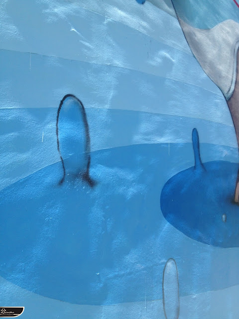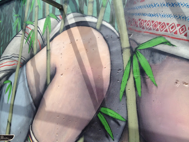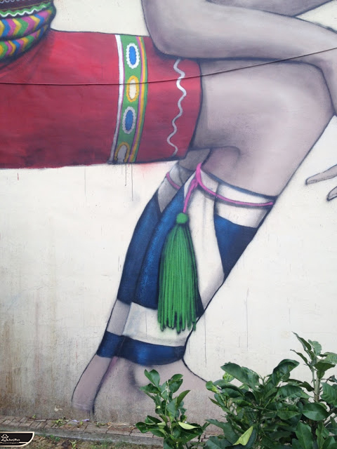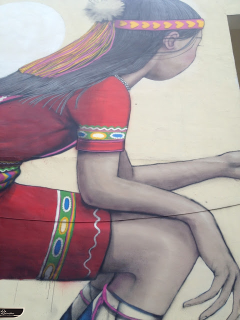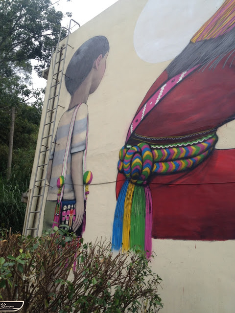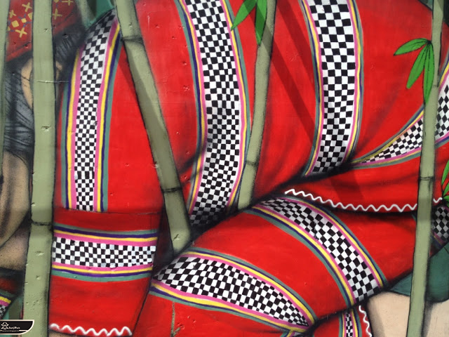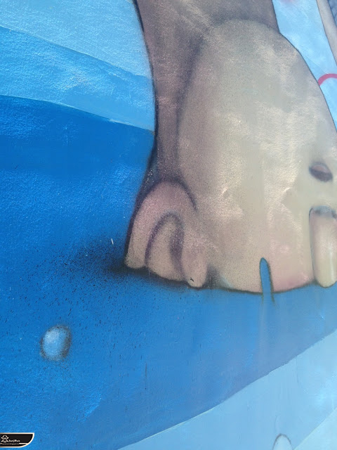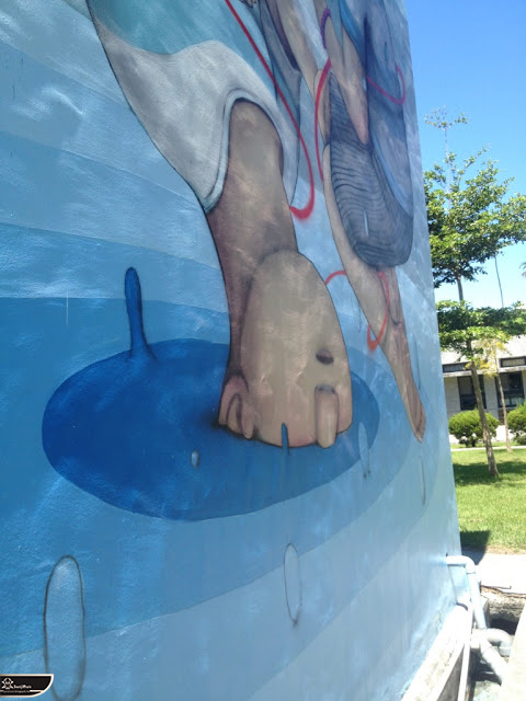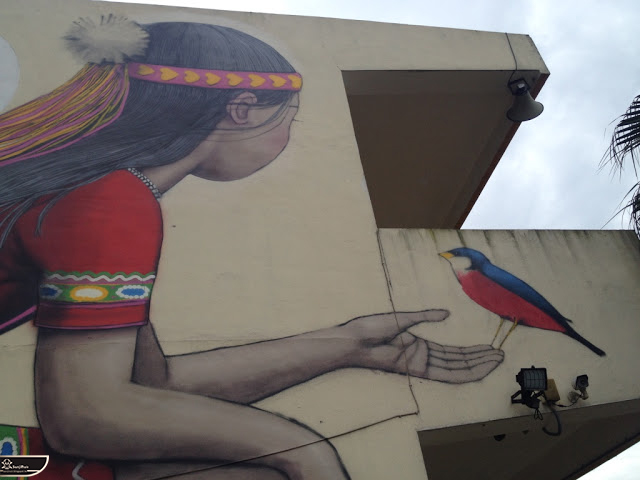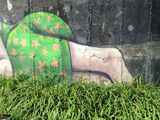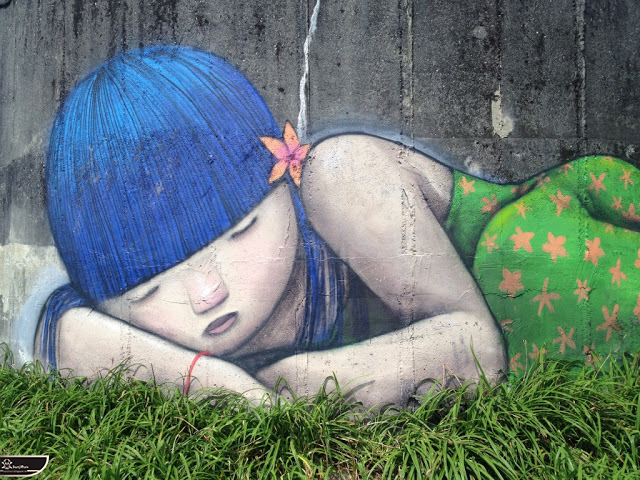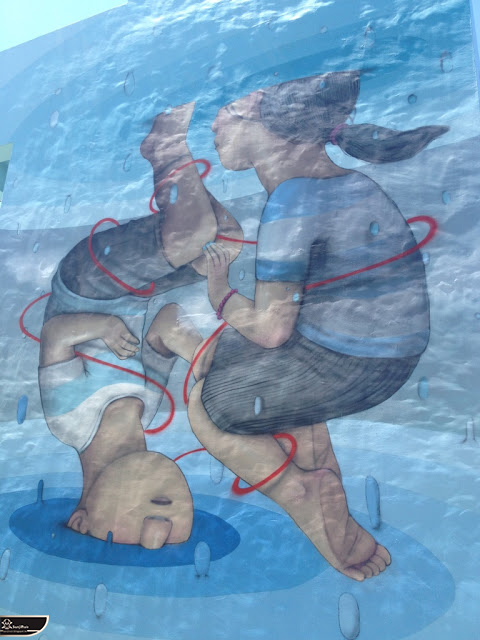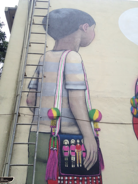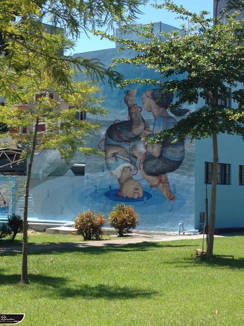 我個人最推崇的是地點選擇,不曉得是主辦單位決定,還是他個人的想法。像是萬安國小教學大樓與男孩、女孩、小鳥那種沈靜的搭配,牆邊的樹又正好成為傳統服飾女孩的座椅;瑞美國小的泳池外牆與主題的搭配,一整個完整。好似在水中看見浮出水面的人,搭配原有的學生描繪學校特點作品,承接順暢;金針花海中的沉睡小女孩的水塔點,整個是渾然天成,不論是看這作品本身或是以作品角度觀看環境,都是美景;錦屏國小那彩虹橋的概念,與學生活動的主要場域操場的對應,我無法挑惕。這些都已突破平面作品的領域,可以說是空間性的裝置作品的表現。作品內容與外在環境的搭配真的是趨近無懈可擊。當然,這是我個人觀點。反過頭再思考後,令我個人感到惋惜的一點,是整個活動的主辦與藝術家並非我國自己開始。不是不好,而是其實我們也做得到。這樣的牆面表現,若是我們的本國企業,也能以這樣的深度,尋找國內藝術家來實現,也許能呈現另外一種不同的氛圍。看到充斥各地的社區牆面彩繪,若能用這樣思維去營造,也許能做出不一樣的層次,而非流於表面的商業性符號。可是,這樣並不代表一定要用彩繪來活化社區,也許個社區本身就有著相當美麗的外觀,彩繪,有時只是矯枉過正。