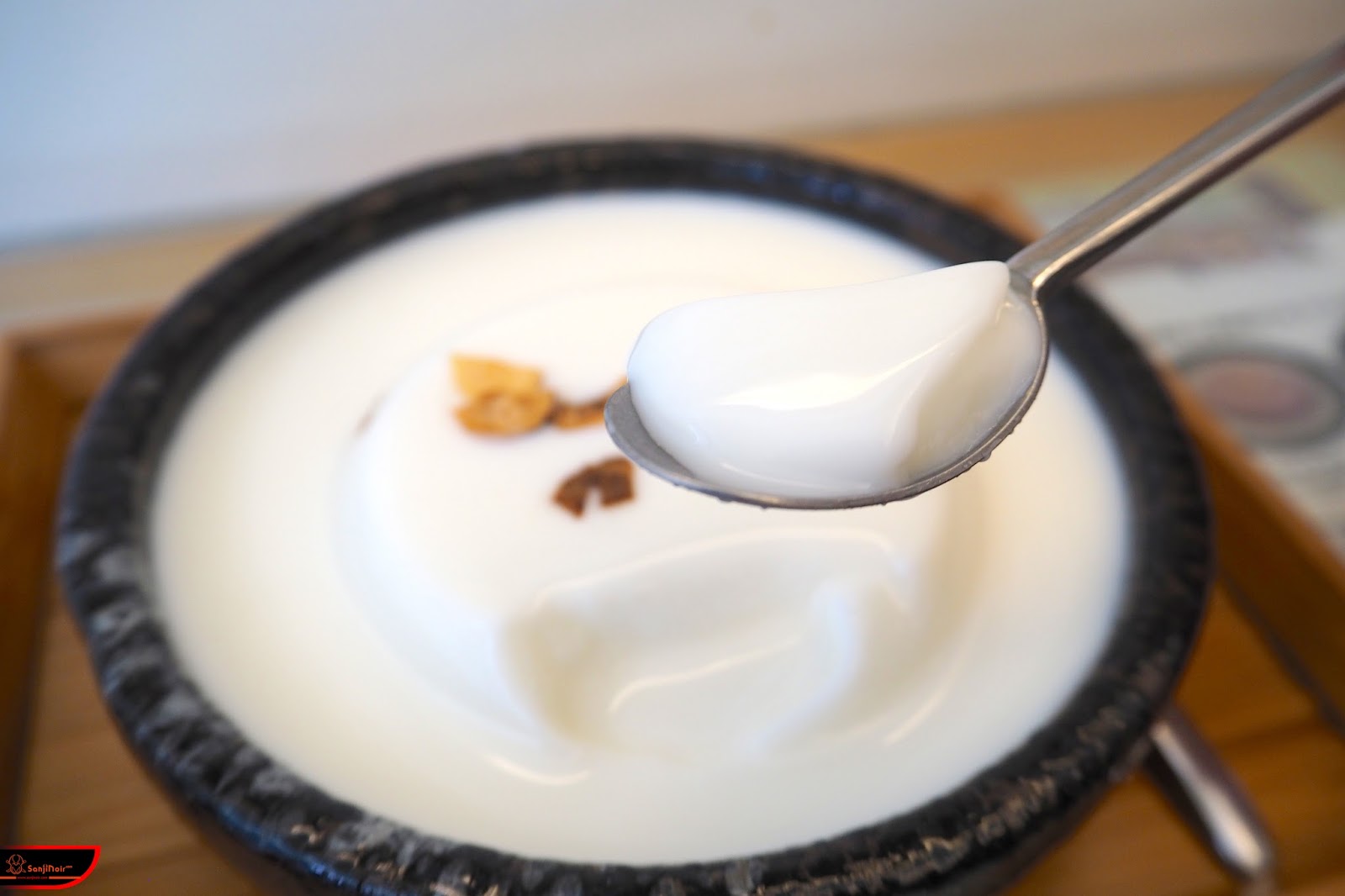 不過之所以點選不加糖的版本其實是因為頗適合用來搭配甜點,除了剛剛的芝麻包之外更可來碗以台南膨餅裝盛的檸檬優格雙淇淋,小巧宛如馬卡龍般的膨餅更是少見的黑糖口味唷!