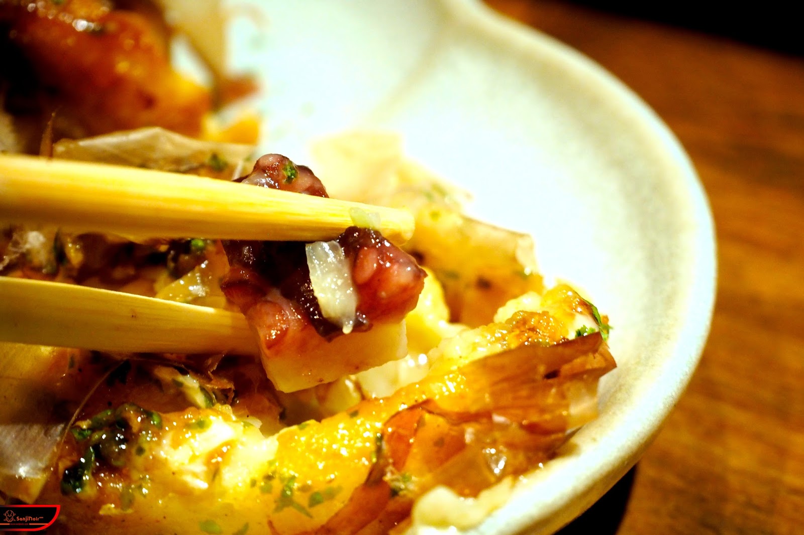或許一般會認為章魚燒這玩意夜市就有,幹嘛還要特別跑到這裡來吃?只能說相較於夜市那外皮口感略硬、裡頭卻吃不太到章魚的章魚燒,蛸屋本舖的章魚燒每一粒接禀持著接近日本大阪的軟嫩口感,除了一口咬下後吃得到滿滿的洋蔥外,最讚的是那切得大塊的章魚肉,這就是為什麼正宗的章魚燒不做出像魚丸般的彈性,因為重點在於吃到章魚的嚼勁啊!
