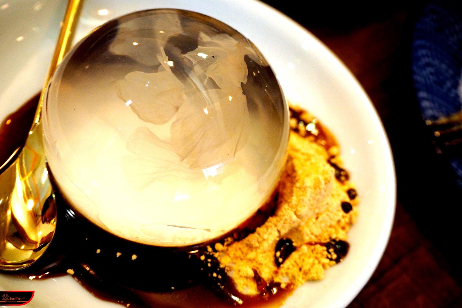 不過相較於名字很長的蛋糕讓人略顯失望,另一份上桌的櫻花水信玄餅倒是令人驚奇。水信玄餅這玩意大概可以說是近幾年日本新創和菓子的最新力作,在歐美稱為雨滴蛋糕(Raindrop Cake),最先是由日本山梨県的製菓老店金精軒所研發。