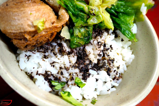 而點選的這碗紫蘇拌飯,其實剛端上時讓在下楞了一下,因為沒想到料竟然比想像中來得豐富。除了有著香而略酸的紫蘇佐拌飯之外,更點綴了青菜和豆製品,也讓整碗紫蘇飯的風味更顯豐富。
