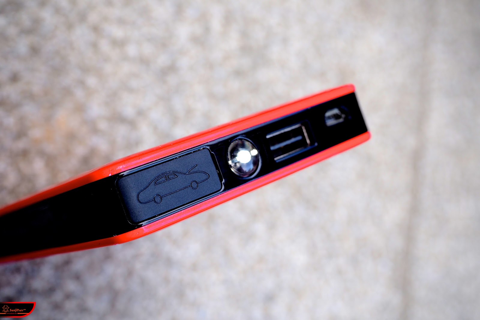 所以側邊除了USB充電、供電和LED照明燈之外,還比其他行動電源多了個救車線連接阜@@