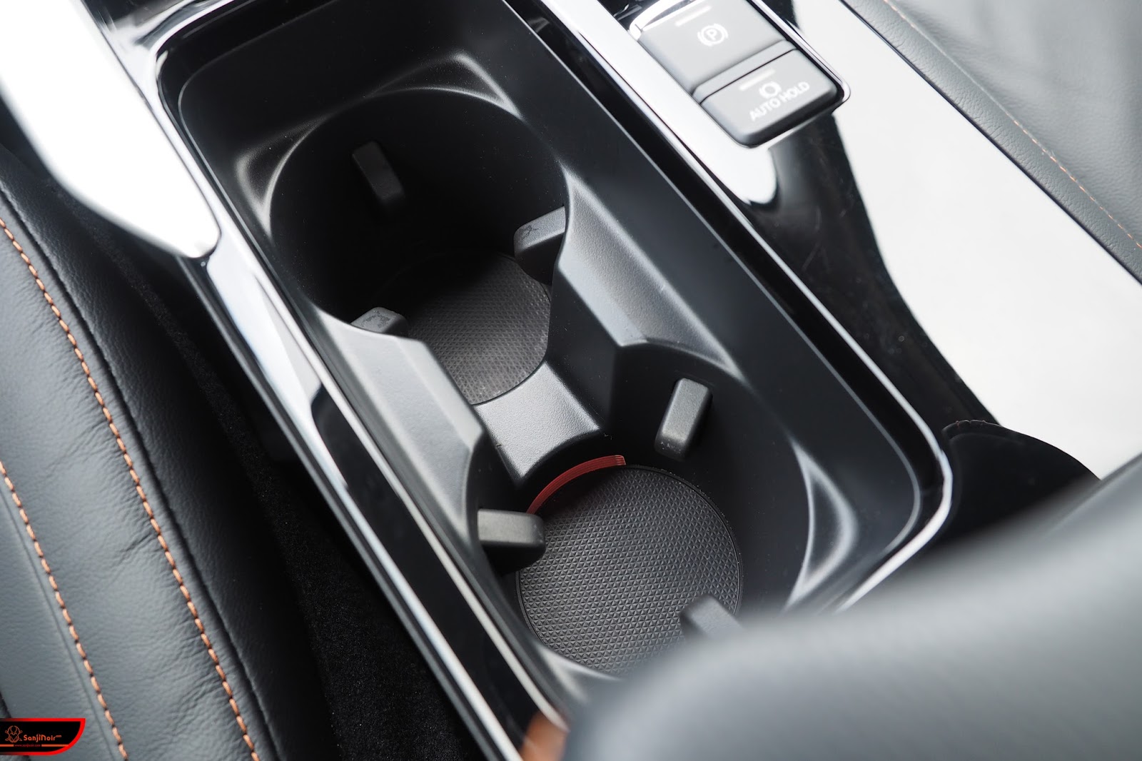 另一點要提及的是原廠為Eclipse Cross部分小地方皆設計了紅色的氣氛燈,包含中控下緣及飲料架。雖然不知道替飲料打光有什麼作用但或許會看起來比較好喝也說不定(喂!)而3爪彈力式的設計也讓杯架能固定多種尺寸的飲品。