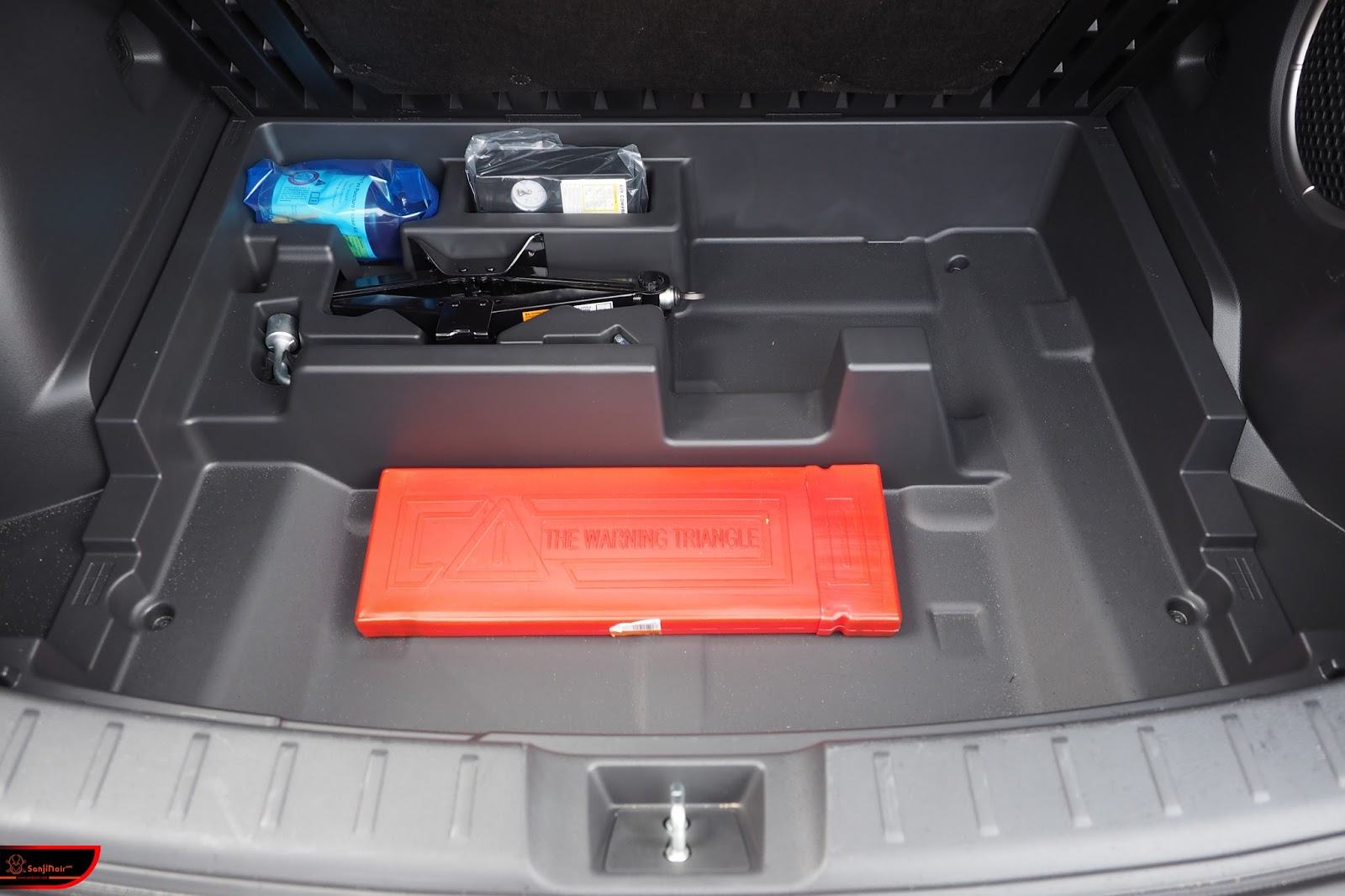 底板掀起後內附掛勾可以固定在後車廂門邊上緣,雖然不像部分歐洲車左右擁有底板掀起專用的卡榫卻也已經屬乎貼心。然基於輕量化及因應時下設計,Eclipse Cross未配置備胎的同時卻也具備補胎工具。話說回來……補胎應該比換胎還來得容易吧?