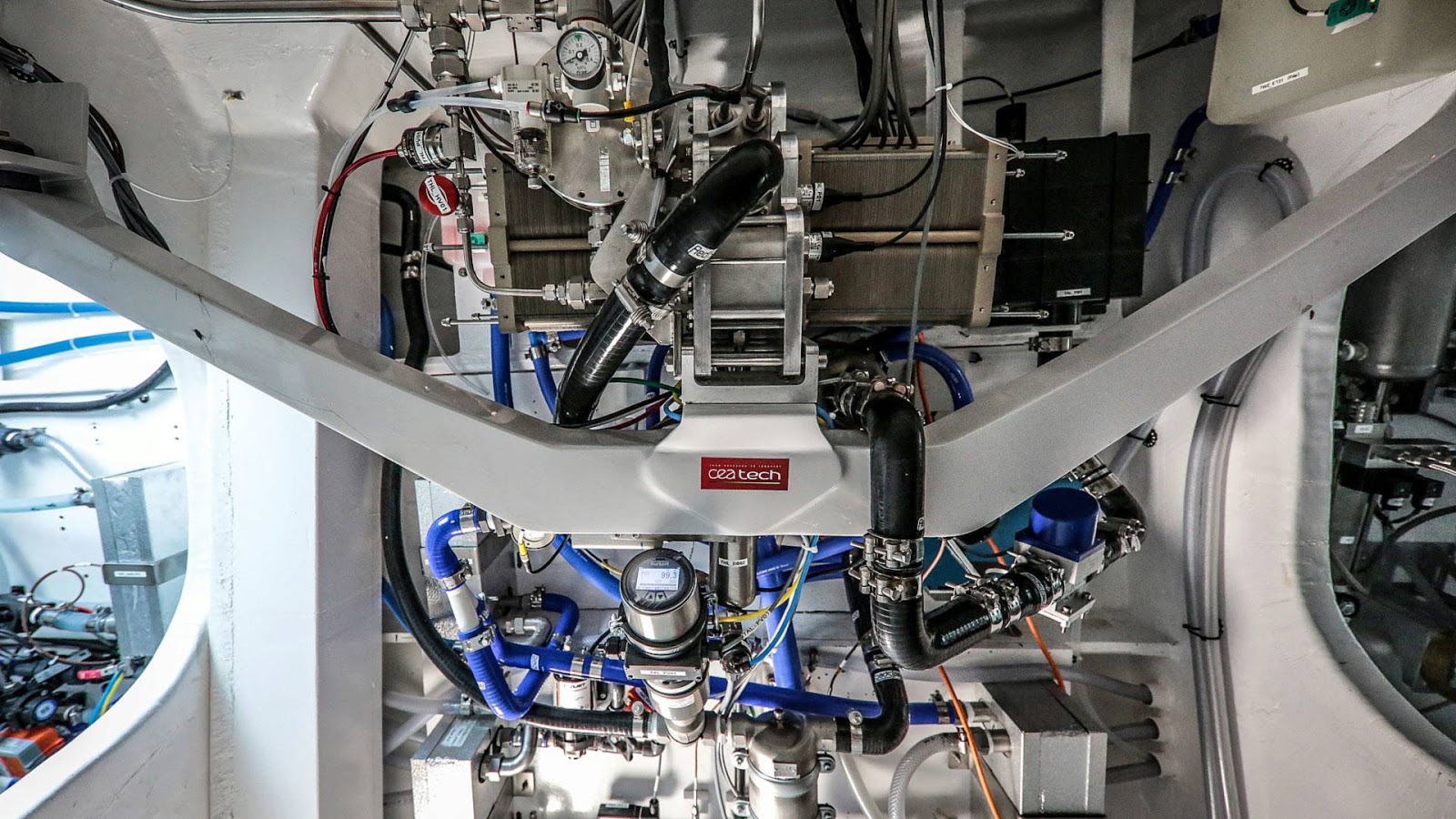 Toyota是一直在倡導開發氫氣技術的品牌,能源觀察者號所使用的一些技術也是來自這間日本車廠的支援,比起需要搭載傳統電池的早期能源方案,這艘船更能獲得重量上的優勢(相比之下節省了船身50%的排水量),此技術也讓船隻克服了陸地和海上的能源供應斷差。