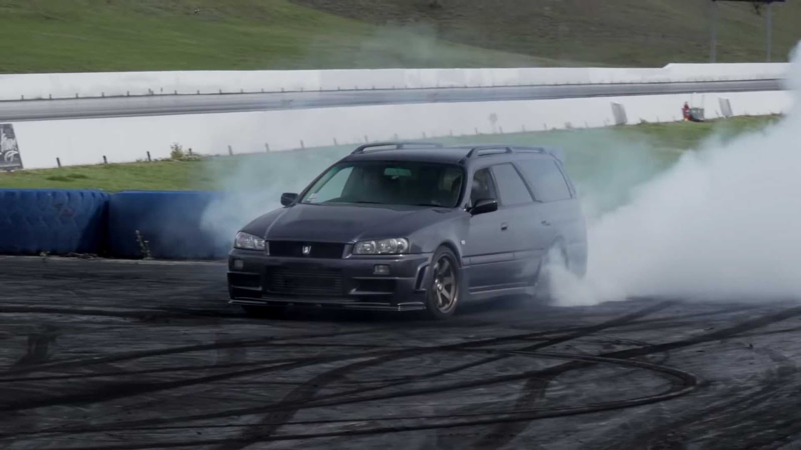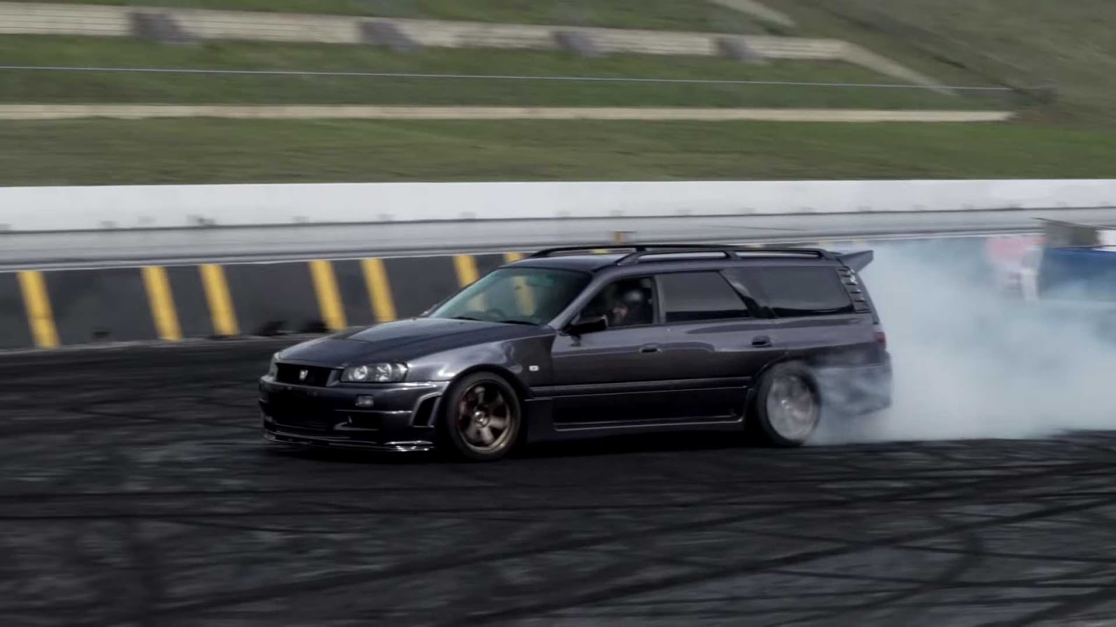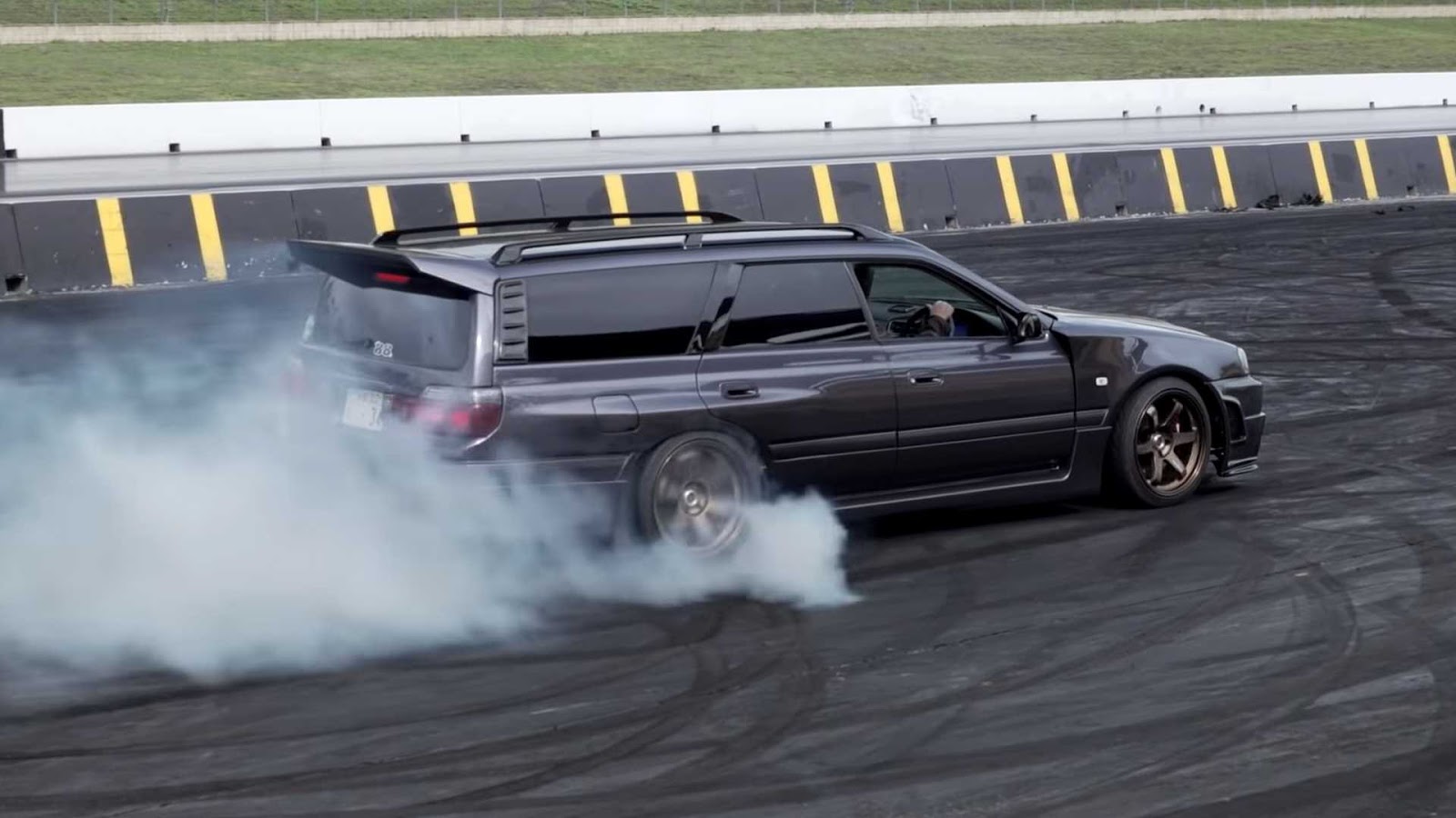 Hoonigan Bonus發布的影片讓我們得以仔細檢視這部怪物旅行車,這是1999 Nissan Stagea RS Four S,也是R34 Skyline車系家族的成員,原廠配置的是代號RB25的6缸渦輪引擎,加上5速手排與四輪傳動系統,其實這樣的原廠配置就已經很有樂趣了,從外觀上來看很難看出這部Stagea有什麼特別之處,真要說的話大概就是R34 Skyline的車頭造型、Rays的改裝輪圈、以及尾翼吧。