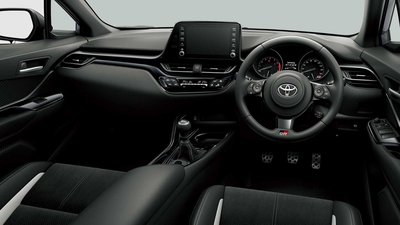 進入車內會發現Toyota C-HR GR Sport配備直徑較小的真皮方向盤,上面有銀色縫線與GR的字樣,包覆性更高的前座座椅也是這個版本的專屬配備,其他像是鋁製踏板組、金屬暗銀色飾板、以及GR引擎啟動鈕也是此車獨有。