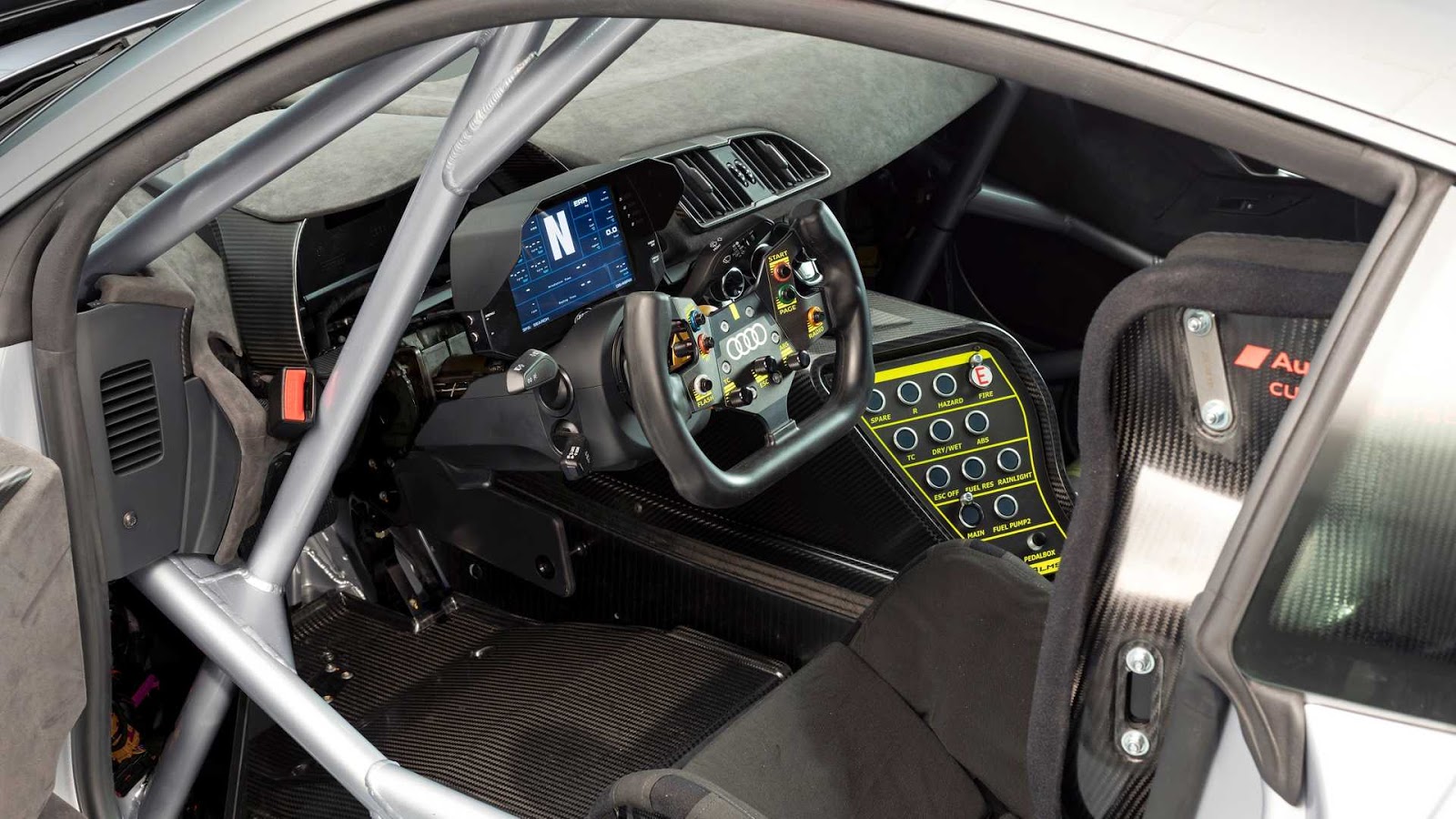 由於賽事規範緣故,車上的5.2升V10引擎在最大輸出上保守的設定在488hp,並搭配七速雙離合器變速箱,小改之後的R8賽道版能讓車手透過方向盤中央的兩個旋鈕,來切換八種預先調整好的ABS和循跡控制系統設定組合,確切的說,Audi Sport把舊的方向盤換成了與今年上旬發表的R8 GT2(630hp)賽車一樣的產品。
