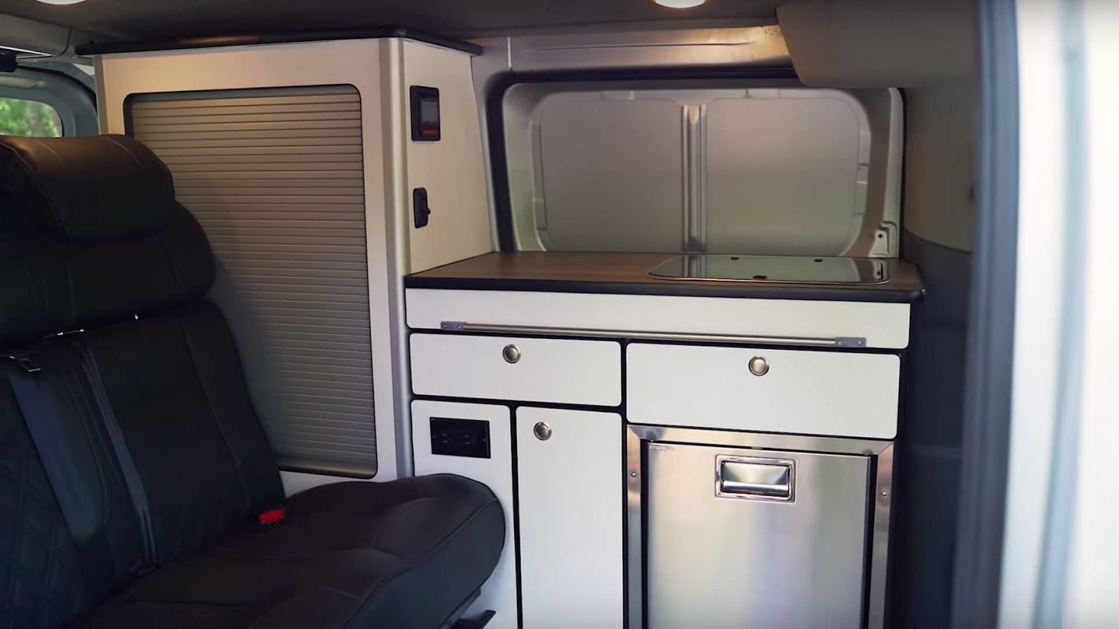 至於其餘的空間則塞滿了許多置物空間與櫥櫃,一直延伸到車尾處,駕駛側後方還有一個全高的櫃子。
