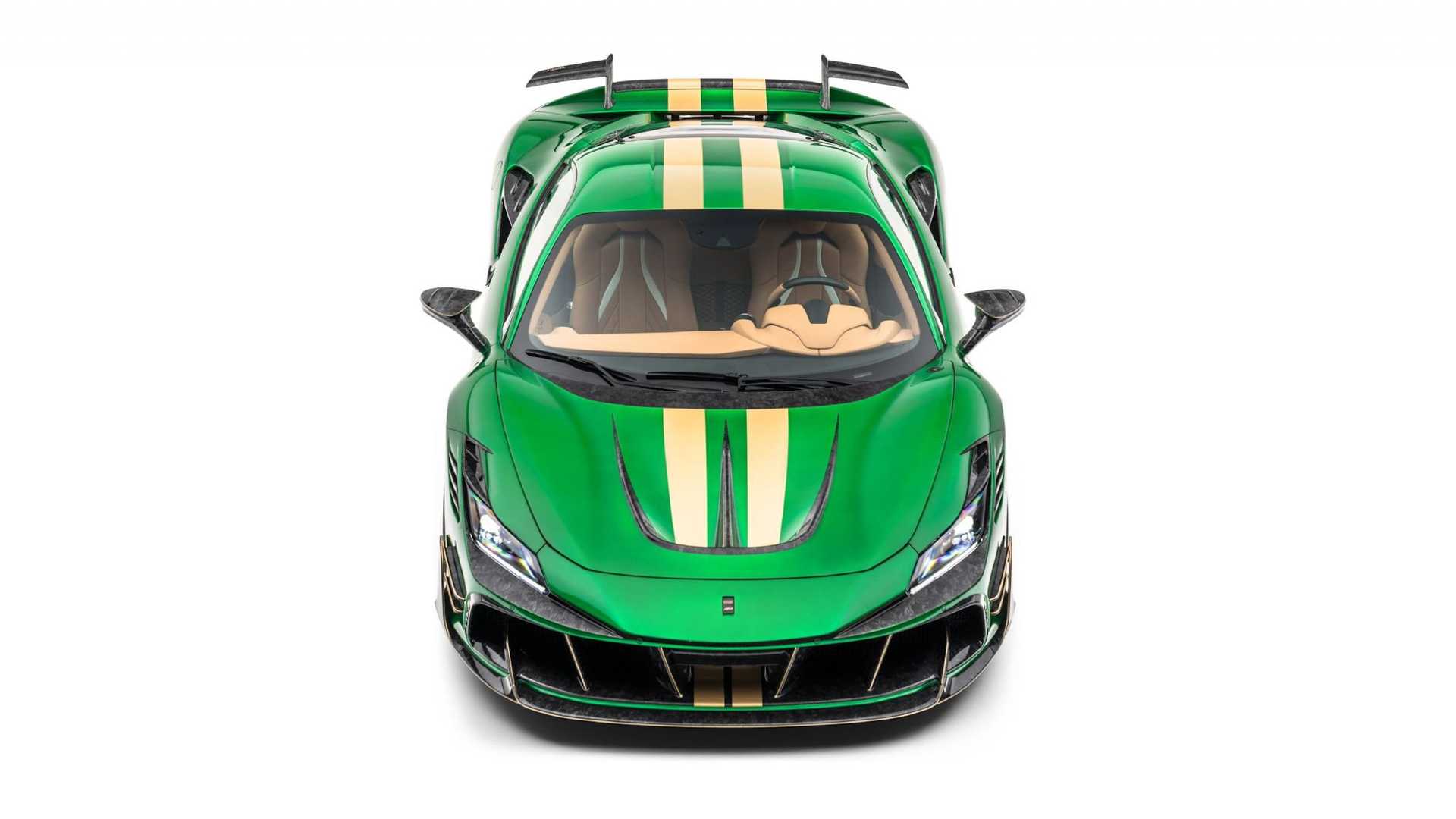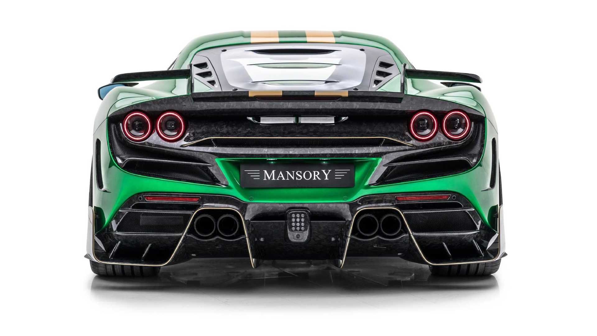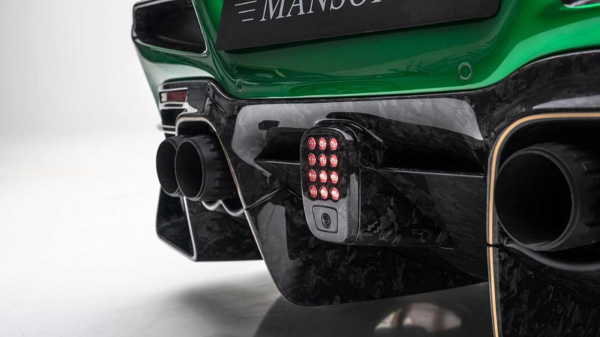 很顯然地,Mansory 的設計師選用了綠色與金色搭配的雙色配色主題,但這還不夠前衛,最值得注意的,肯定是車尾那組尾翼,設計師捨棄了傳統的尾翼造型,改用兩支各自獨立的 L 型尾翼,中央部分則維持原車線條,看上去很像是某種天線,同時,其他部分也改裝了大量的碳纖維配件,舉凡一般改裝作品該有的前下巴、側裙、後下導流器等等一應俱全。