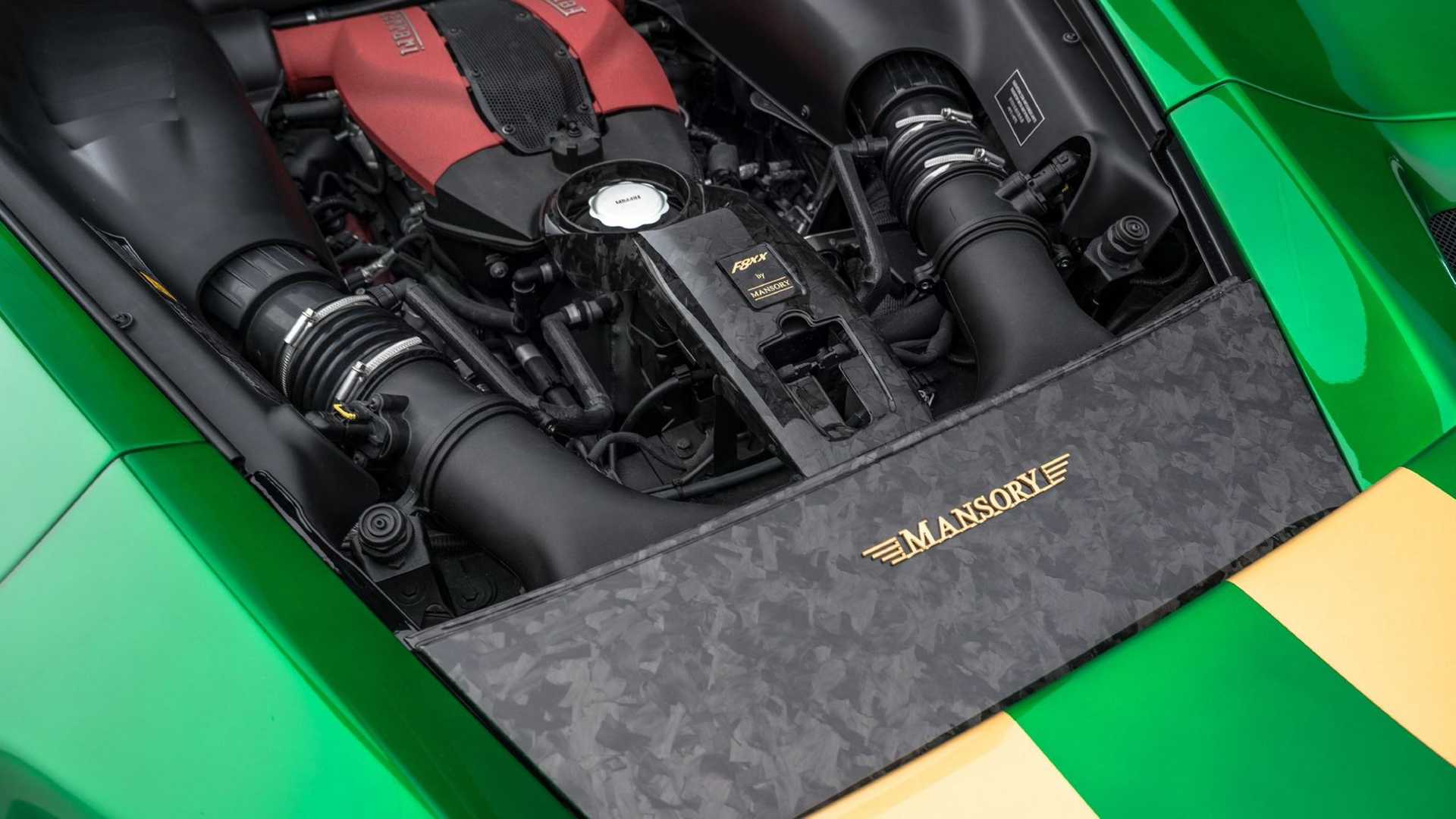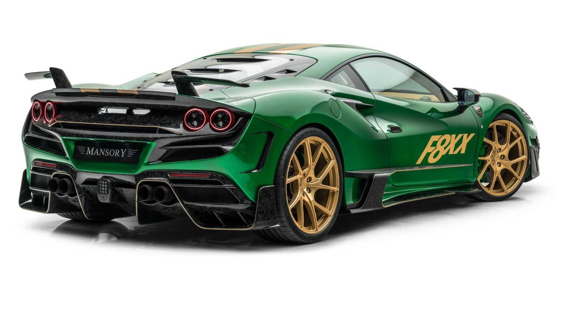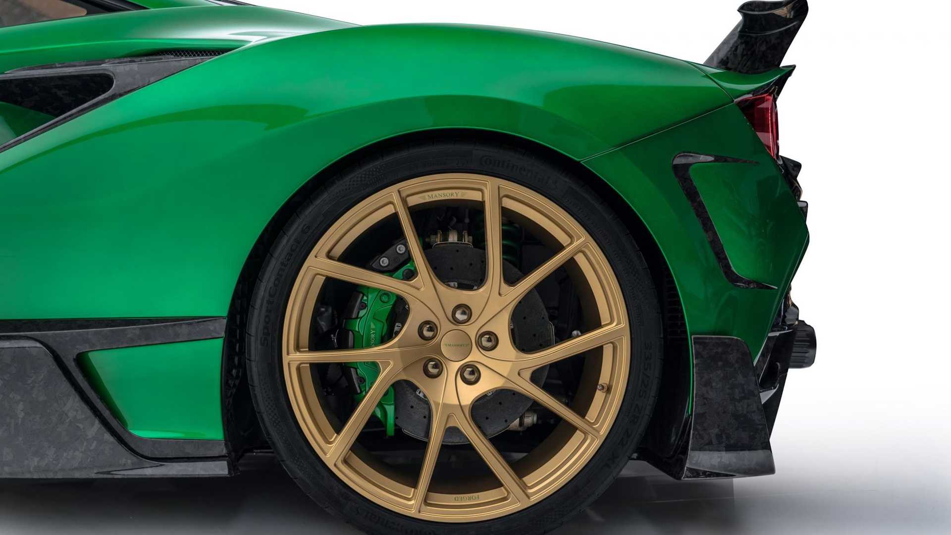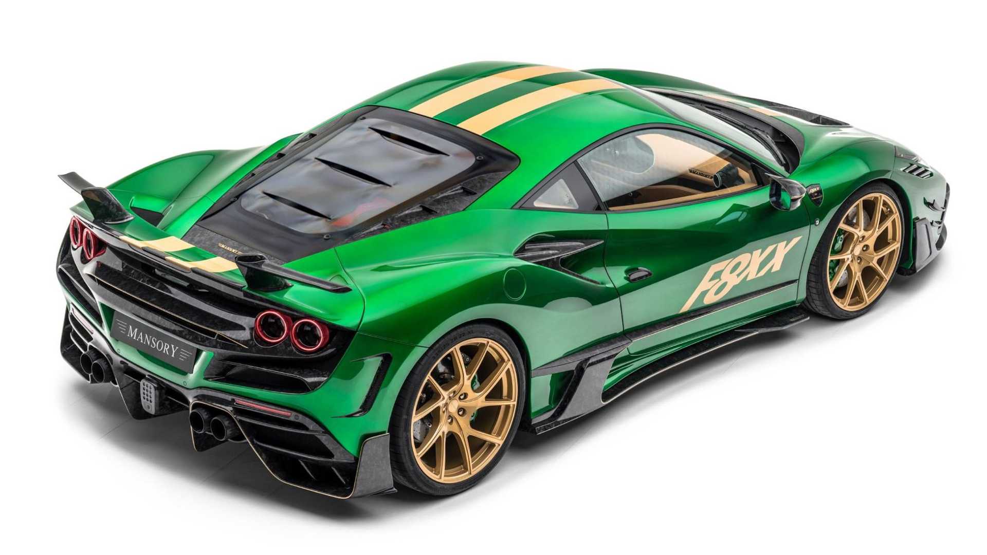 很顯然地,Mansory 的設計師選用了綠色與金色搭配的雙色配色主題,但這還不夠前衛,最值得注意的,肯定是車尾那組尾翼,設計師捨棄了傳統的尾翼造型,改用兩支各自獨立的 L 型尾翼,中央部分則維持原車線條,看上去很像是某種天線,同時,其他部分也改裝了大量的碳纖維配件,舉凡一般改裝作品該有的前下巴、側裙、後下導流器等等一應俱全。