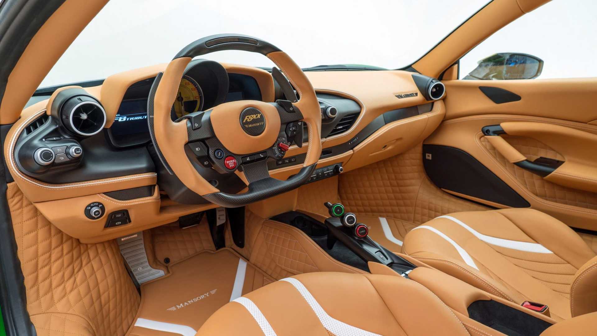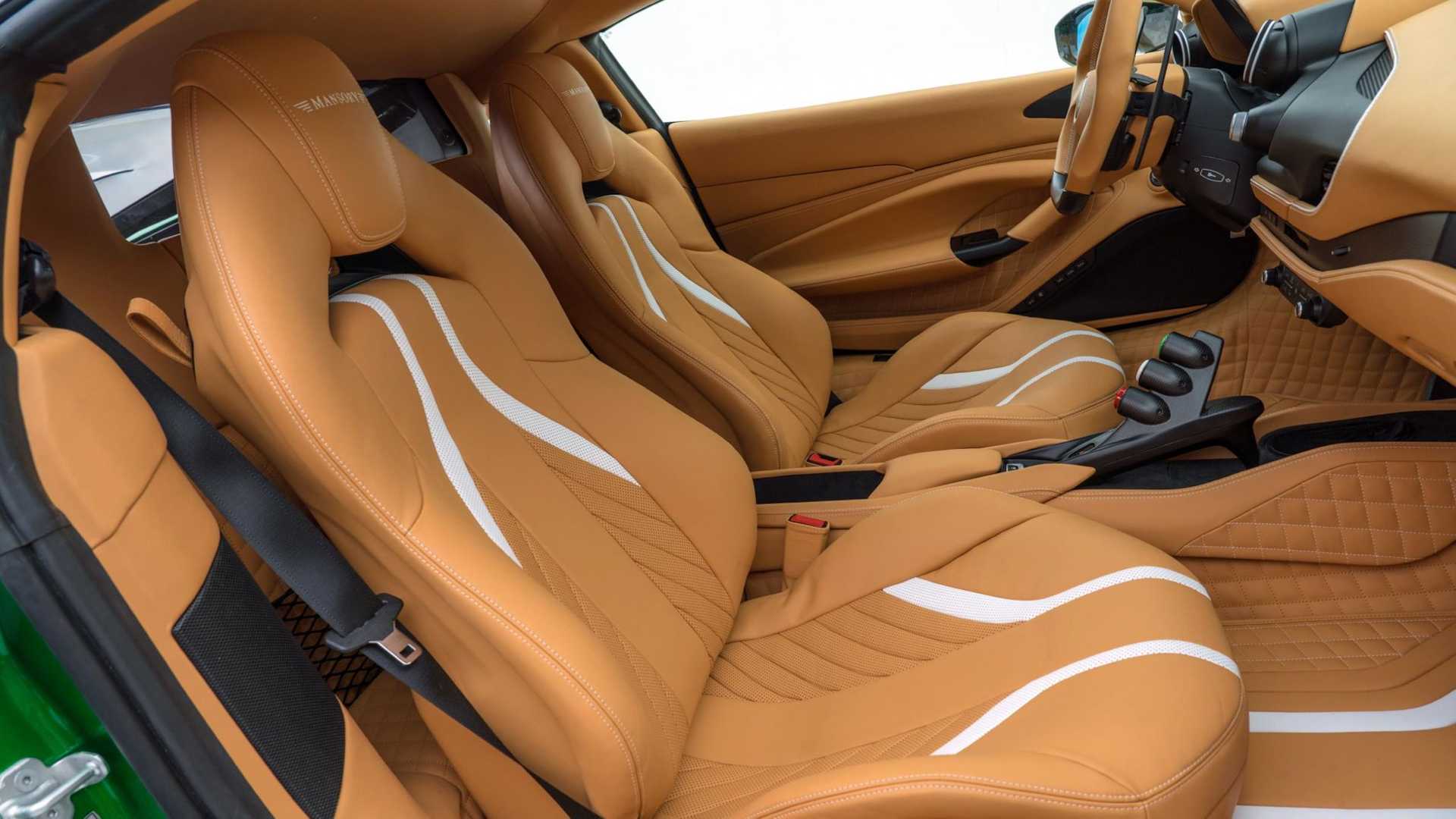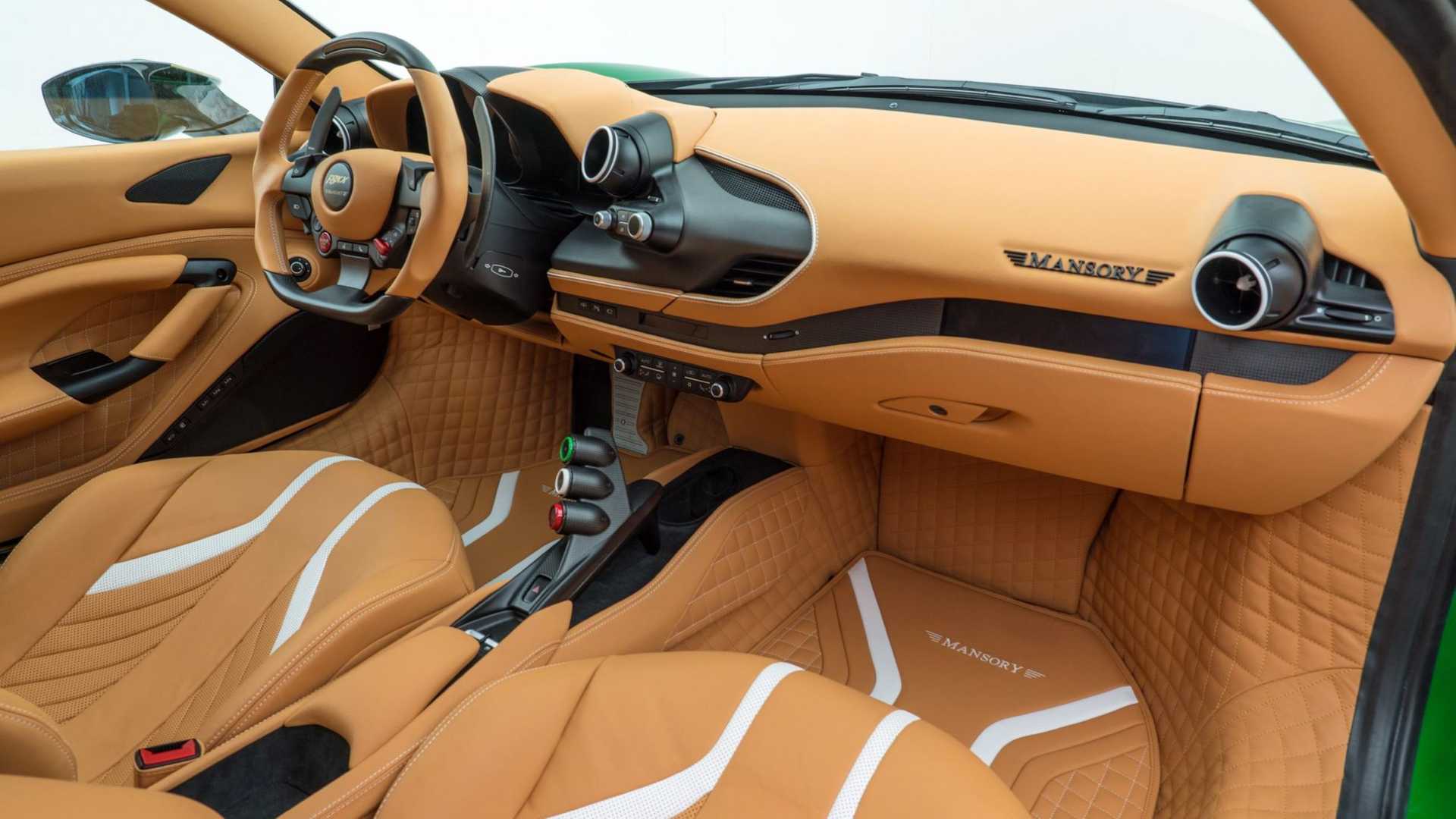 內裝方面,Mansory 以米色皮革、白色點綴、和碳纖維飾板重製了整個車內,真皮方向盤上看得到 Mansory 的徽章,連地墊都有喔,米色的內裝剛好能搭配外觀的金色元素,形成完整的視覺效果。