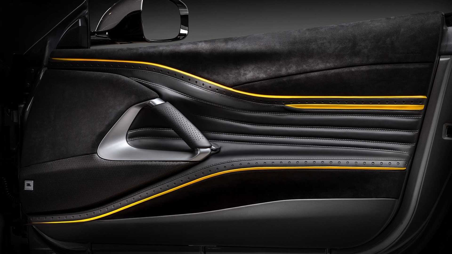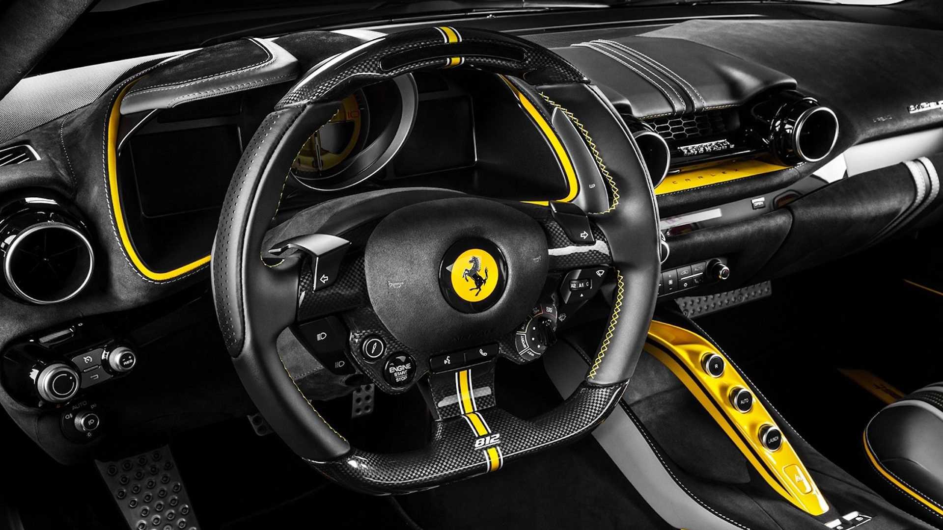 812 Superfast 畢竟是 Ferrari 的車款,因此原廠就帶有相當水準的內裝,不過來自波蘭的改裝廠毅然決然地把整組內裝砍掉重練,重新設計了座椅、車門、甚至是車頂篷,採用大量的黑色 Alcantara 麂皮作為基礎,再添加黃色的元素調和,將其散落在整個車室,包括儀表板也是如此,精心設計的座椅也表現出超級跑車的氣魄。