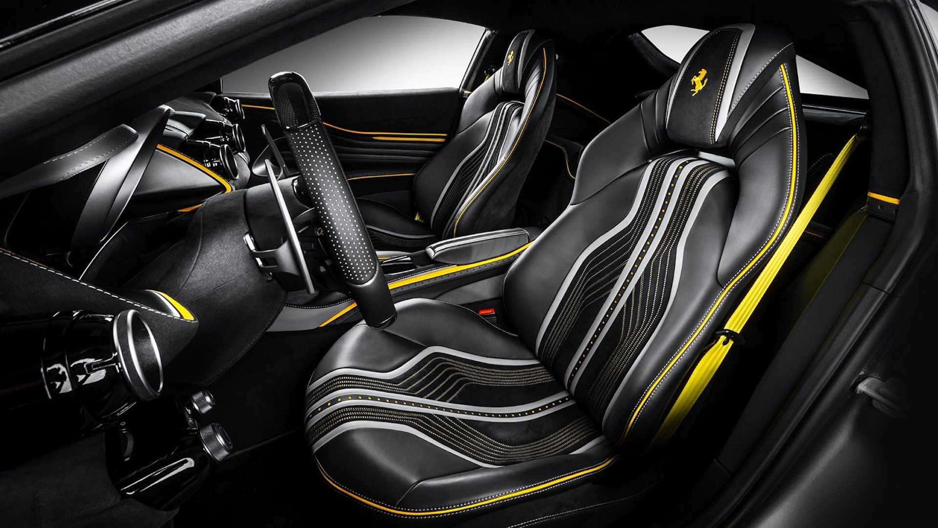 在黑色與黃色之外,設計師也帶來了白色對比縫線與碳纖維材質,讓內裝層次更豐富,車頂篷特別值得一看,黑色麂皮與白色縫線加上 Ferrari 的廠徽,極為搶眼。