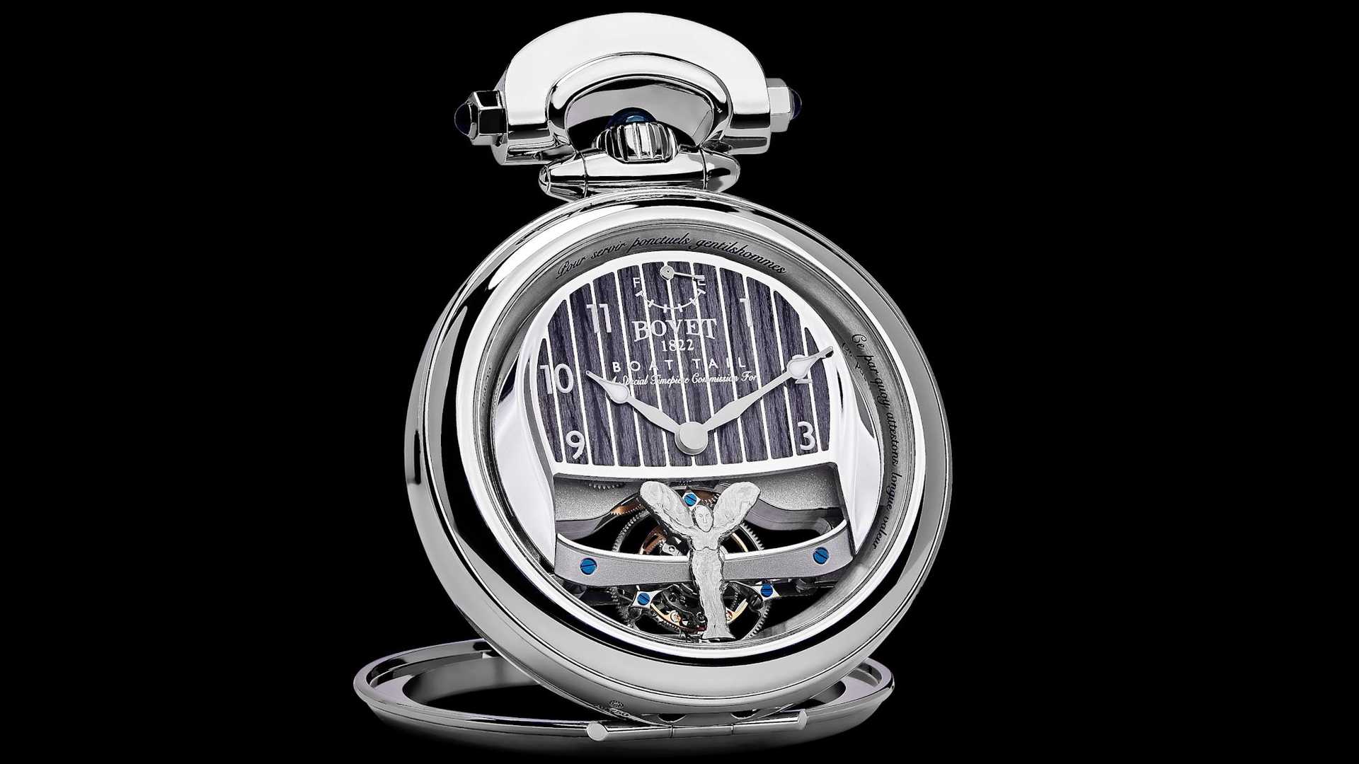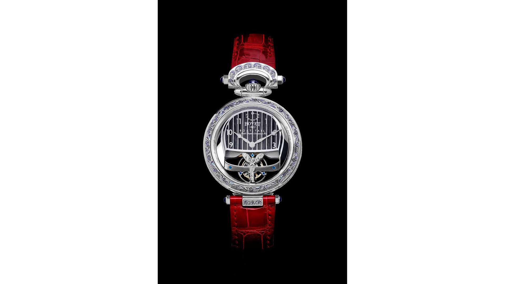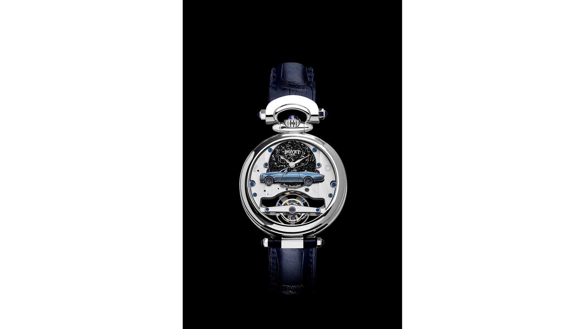 Bovet 特別打造了新的 44mm、18 克拉黃金製成的錶殼,且經過汽車產業的震動與碰撞測試,符合標準要求,Bovet 的工匠還植入了專屬設計的陀飛輪,可以在震動較多的車上維持精準的時間計算,機芯擁有能運行 5 天的能量,這讓配戴者不需太擔心準確性的問題,透過錶面玻璃可看到內部有一個手工打造的「歡慶女神(Spirit of Ecstasy)」雕刻,一樣是用黃金製作。